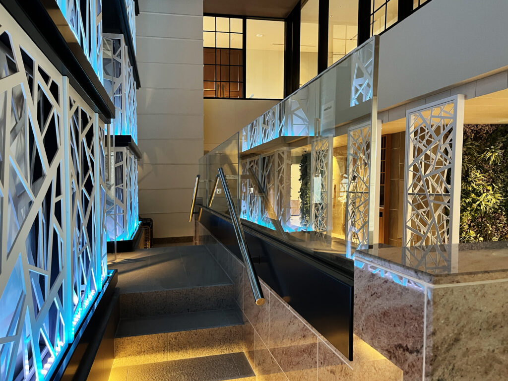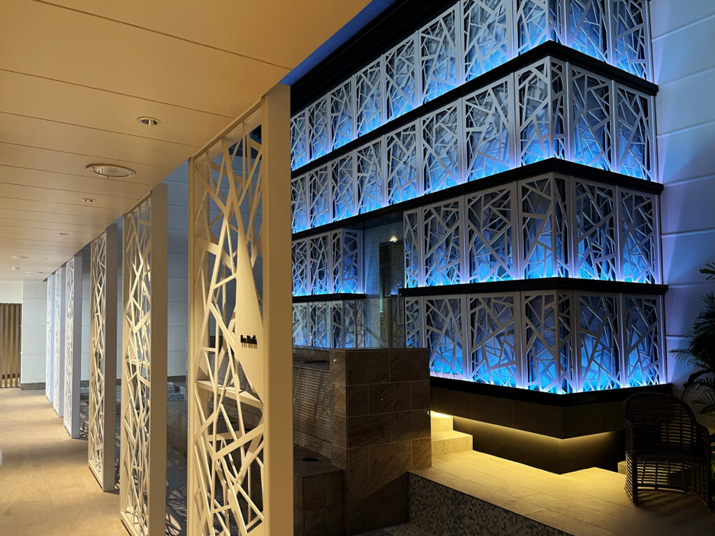 斬新なデザインは、クールサウナに隣接する空間にふさわしく、雪の結晶を想起させる繊細なパターンを採用。沖縄という温暖な環境の中で、視覚的に“涼”を感じさせる空間演出を実現しています。光や視点の変化によって多様な表情を生み出し、感性に訴える印象的な空間を創出しています。